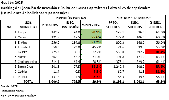 A diferencia de otras grandes capitales, Tarija aparece en el grupo reducido de municipios que lograron un mejor desempeño. El economista Julio Linares explicó que Tarija (58.9), junto con Oruro (55.6) y El Alto (51,2), lidera la ejecución de inversión pública en 2025, mientras que Cochabamba (20,5%), Santa Cruz (12,2%), Cobija (4,8%) y Potosí (3,7%) se ubican en los últimos lugares.